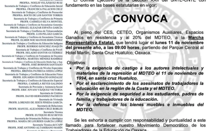 Integrantes de la Sección 22 de la CNTE anunciaron una marcha representativa estatal el próximo lunes 11 de noviembre a las 09:00 horas en Santa Cruz Huatulco, .