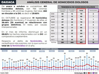 Al presentar estadísticas denominadas “Análisis general de homicidios dolosos”, el titular de la @SEGO_Oax informó que de enero a octubre en Oaxaca se contabilizaron 851 homicidios dolosos con 766 víctimas masculinas y 85 femeninas. De esta cifra, 260 casos están asociados a la Delincuencia Organizada.