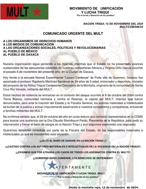 “Nuestra organización sigue poniendo a los muertos”, acusa la dirigencia del Movimiento de Unificación y Lucha Triqui (@siimachumaa ) en un comunicado al referirse a los recientes homicidios de las hermanas Adriana y Virginia Ortiz García, y del profesor Rigoberto Martínez Sandoval.