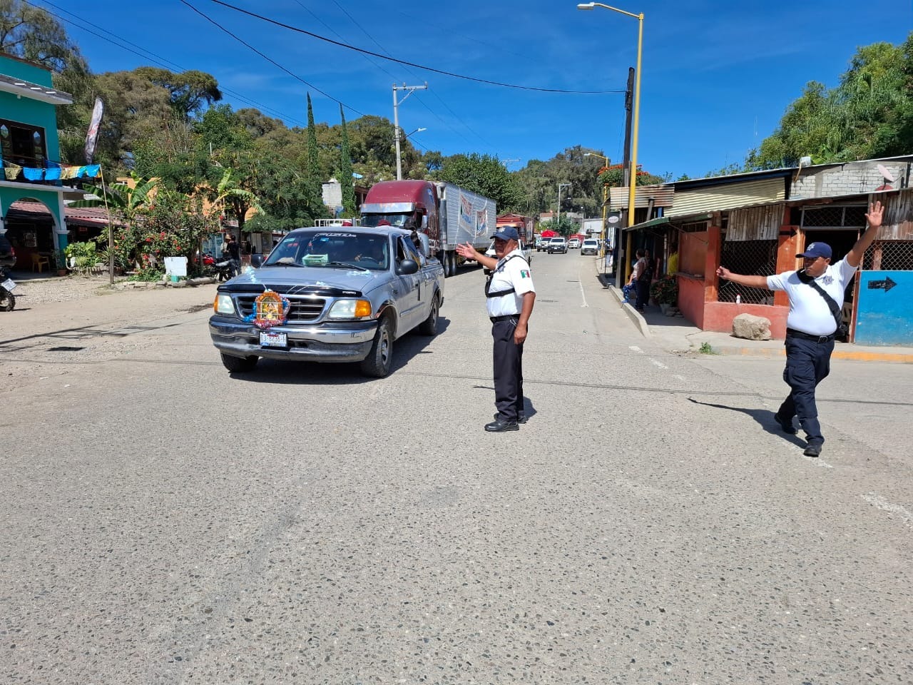 Elementos de esta corporación realizan acciones de abanderamiento, proximidad social y ayuda ciudadana para resguardar y dar seguridad vial a personas peregrinas que acuden como cada año al Pueblo Mágico de Santa Catarina Juquila.