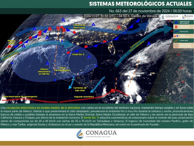 El frente frío número 11 se ha frenado sobre el noreste de la República Mexicana, se espera que reinicie su movimiento este jueves hacia el sureste para generar un nuevo evento de norte el fin de semana, así como descenso térmico.