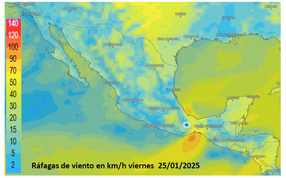 Además, la masa de aire frío y alta presión que cubre el oriente, centro y sureste de México, recibirá nuevas aportaciones de aire ártico, lo que originará un incremento en la intensidad del viento con rachas de 80 a 100 kilómetros por hora en el oriente del Istmo y en menor intensidad en zonas altas y descampadas, por lo que permanecerá el oleaje elevado en aguas del Golfo de Tehuantepec.