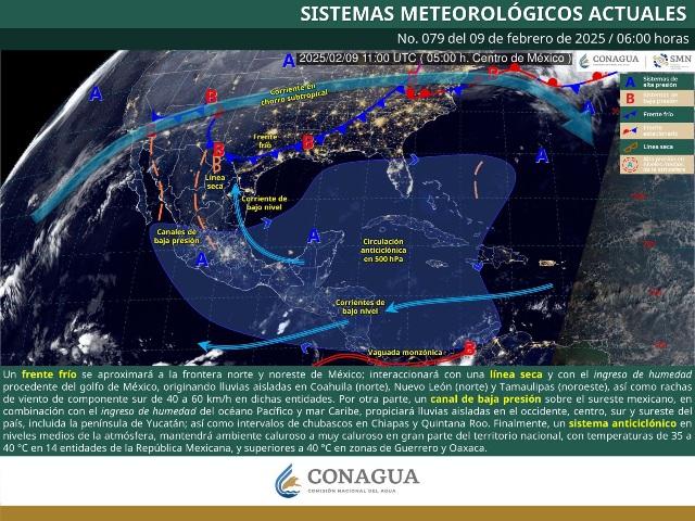 Oaxaca de Juárez, Oax. 9 de febrero de 2025.- La Coordinación Estatal de Protección Civil y Gestión de Riesgos (CEPCyGR) informa que, para este domingo, la amplia circulación anticiclónica situada en niveles medios de la troposfera con influencia en gran parte de México, mantendrá un ambiente caluroso a muy caluroso en zonas del Istmo de Tehuantepec y Costa.