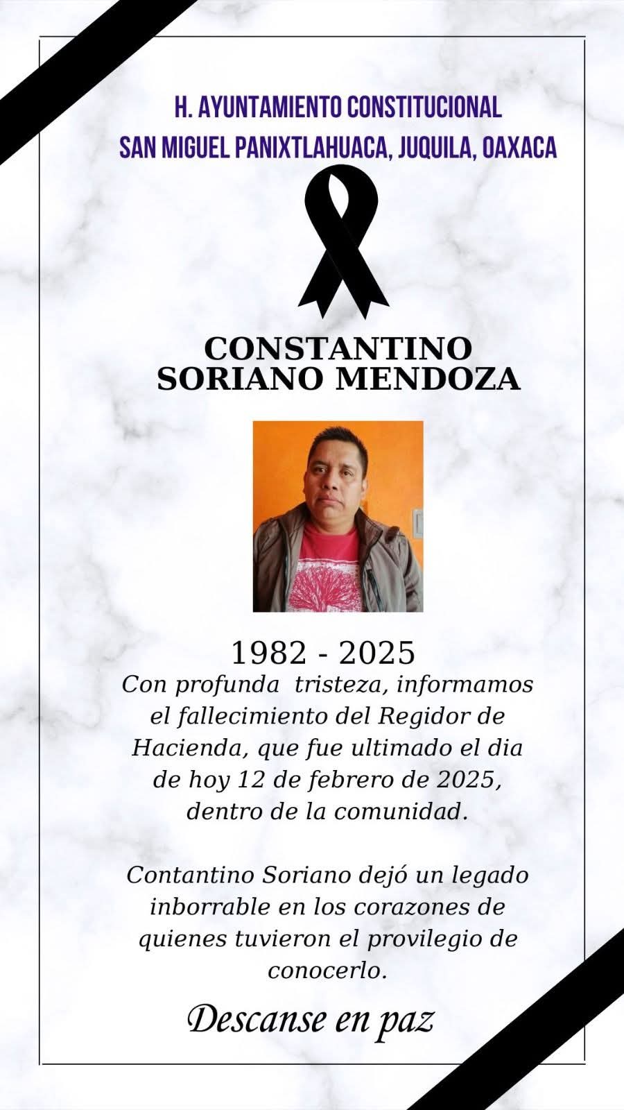 Autoridades municipales de San Miguel Panixtlahuaca informaron del homicidio del regidor de Hacienda, Constantino Soriano Mendoza, por sujetos desconocidos que le dispararon el mediodía de este miércoles.