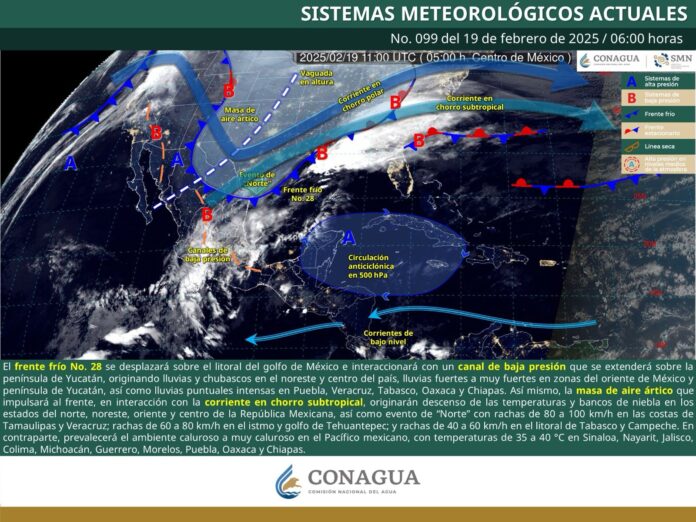 Lo anterior, a causa de que el frente frío número 28 ingresó esta mañana al Golfo de México, el cual se desplazará rápidamente hasta alcanzar el sur de Veracruz y occidente de Tabasco esta noche, donde es muy probable que permanezca semiestacionario, interactuado con un canal de baja presión sobre el sureste del país.