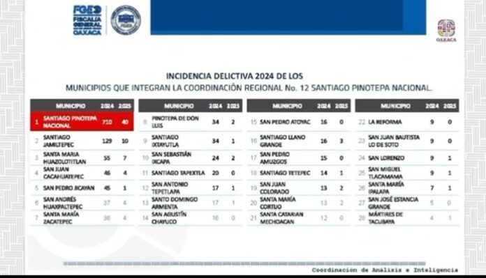 La coordinación regional 12 con sede en Pinotepa Nacional, está conformada por 28 municipios costeños, siendo Pinotepa el de mayores registros delictivos, después Santiago Jamiltepec, Santa María Huazolotitlán, San Juan Cacahuatepec y San Pedro Jicayán.