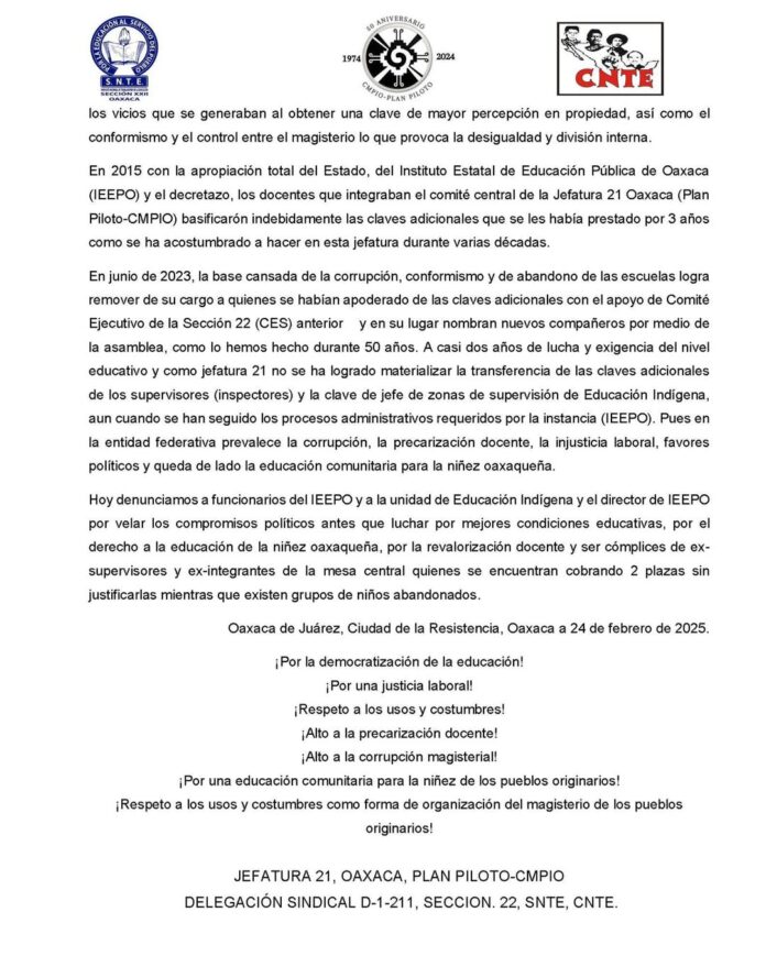La Coalición de Maestros y Promotores Indigenas de Oaxaca denunció a funcionarios del Instituto Estatal de Educación Pública de Oaxaca (@IEEPOGobOax ) y a la Unidad de Educación Indígena por priorizar los compromisos políticos en lugar de impulsar mejores condiciones educativas y el derecho a la educación de la niñez oaxaqueña.