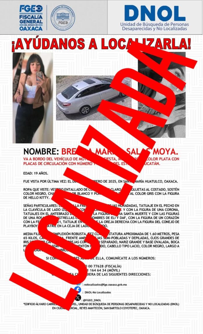 Gracias a la intervención oportuna y la inmediata activación de protocolos de búsqueda, fue posible dar con el paradero con vida de Brenda Mariel Salas Moya, quien fue localizada en el Estado de Puebla.