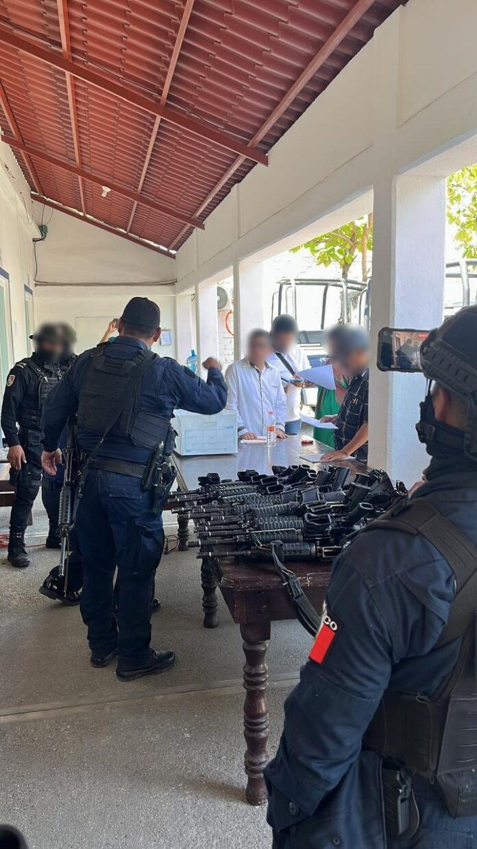 Fiscalía de Oaxaca, DEFENSA, Secretaría de Marina, Guardia Nacional y Policía Estatal realizan cateo y aseguran armas de la Policía Municipal de Santa Cruz Huatulco, investigaciones por desaparición y homicidio de cinco personas originarias de Tlaxcala