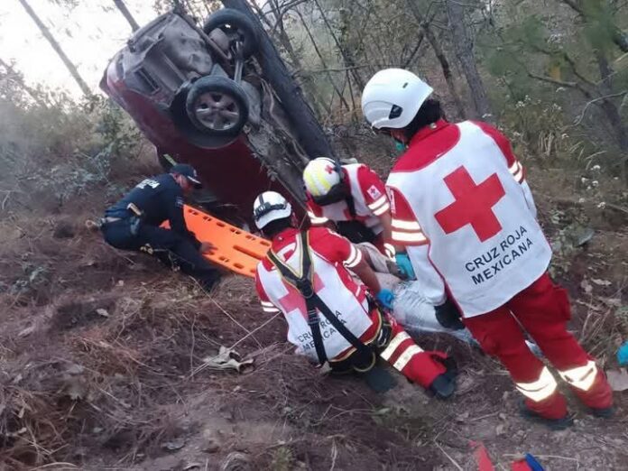 Personal de auxilio y paramédicos atendieron a los lesionados bajando al fondo de la barranca donde el vehículo quedó atorado entre los matorrales.
