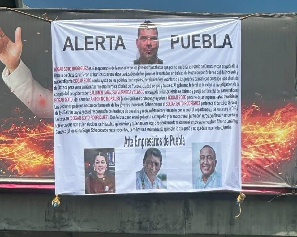 Como guerra sucia calificó Salomón Jara Cruz (@salomonj ), gobernador de Oaxaca, la aparición de una manta en un puente vehicular poblano donde supuestos “empresarios de Puebla” atribuyen la desaparición y masacre de jóvenes tlaxcaltecas a un jefe delincuencial vinculado al senador Antonino Morales Toledo ( @Nino_Morales1 ) y la titular de @SecturOaxaca Saymi Pineda Velasco (@saymipinedav ).