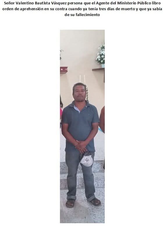 • Evidenciamos la falta de profesionalismo y falta de investigación seria por parte de la Fiscalía General del Estado de Oaxaca y del Juez de control que libró la orden de aprehensión, así como el juez de consigna que conoce del caso, ya que se libró una orden de aprehensión en contra del señor Valentino Bautista Vásquez que falleció el día 25 de marzo del 2025 y que el Ministerio Público solicita que se libre orden en contra del muerto tres días después de su fallecimiento y que fue librada por el Juez de Control de Miahuatlán en ese mismo día y que solo en Oaxaca se dan este tipo de situaciones donde se libran orden de aprehensión en contra de las personas fallecidas.