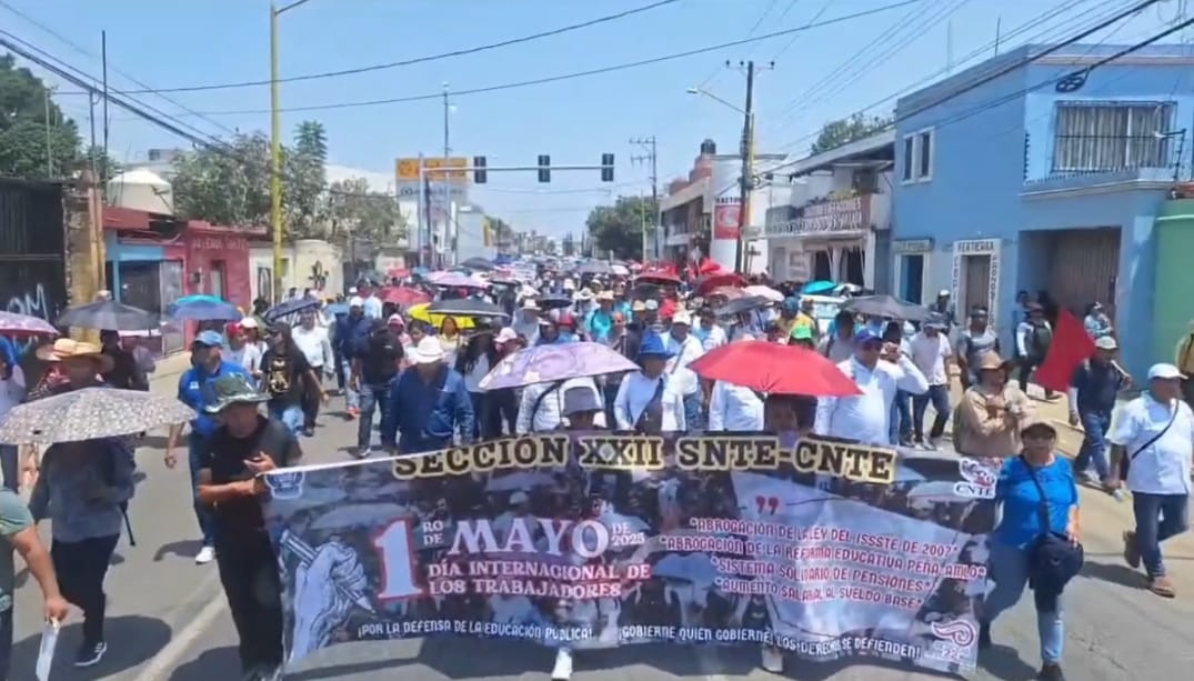 En el marco del Día Internacional del Trabajo, la Sección XXII del Sindicato Nacional de Trabajadores de la Educación ( @Seccion22Cencos) realiza una marcha en la ciudad de Oaxaca.