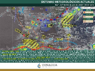 Oaxaca de Juárez, Oax. 3 de julio de 2025.- La Coordinación Estatal de Protección Civil y Gestión de Riesgos (CEPCyGR) informa que este jueves la onda tropical número 8 inestabilizará el sur y sureste de México. En la medida que avance hacia el oeste se combinará con una baja presión con potencial para desarrollo ciclónico y con la vaguada monzónica, generando así nubosidad de carácter convectivo que puede desarrollar lluvias y tormentas vespertinas.