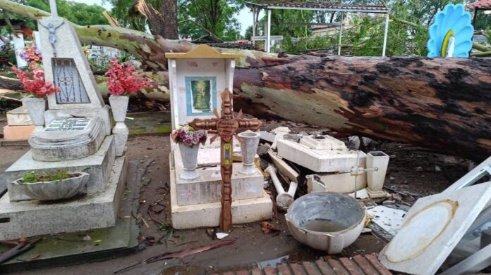 La tormenta acompañada de intensos vientos que azotó la tarde de este jueves a Ejutla de Crespo provocó la caída de dos árboles en el panteón de Dolores, lo que ocasionó daños en distintas tumbas.