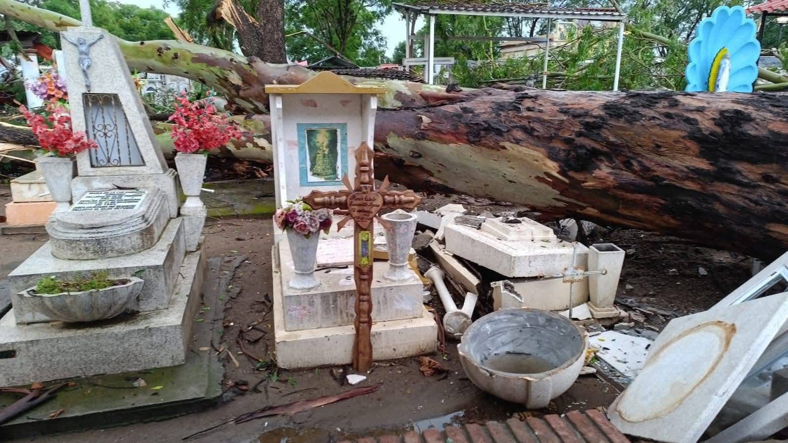 Imágenes y videos difundidos por la cuenta de Facebook Los Informantes muestran la magnitud de los troncos caídos y el deterioro en el camposanto.