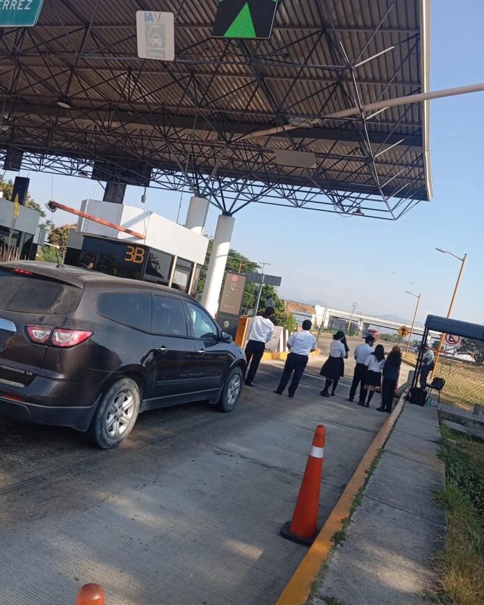 Los normalistas se colocaron en los accesos de la caseta portando mantas y vistiendo el uniforme de la institución, bajo una protesta de carácter pacífico.