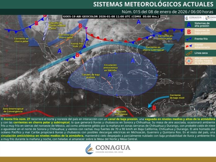 Lo anterior, se debe a una circulación anticiclónica que se desplazará durante este jueves hacia el oriente del Golfo de México, permitiendo el ingreso del frente frío número 27, el cual tendrá efectos directos y traerá mezclas invernales durante el fin de semana.