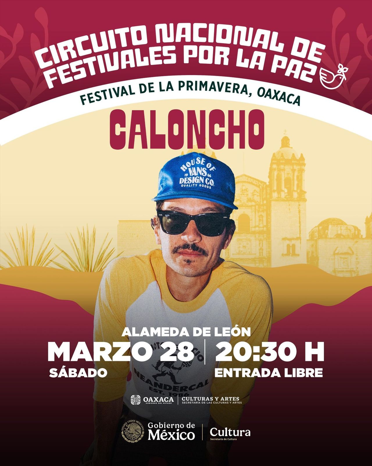 La Secretaría de las Culturas y Artes de Oaxaca (Seculta) invita a la ciudadanía a disfrutar del concierto gratuito de Caloncho, en la Alameda de León, en Oaxaca de Juárez; que forma parte del Circuito Nacional de Festivales por la Paz financiado por el Gobierno de México.
