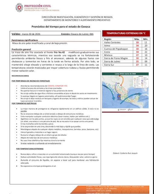 Para este lunes, los valores máximos y mínimos previstos son: Valles Centrales, 28 y 12 grados; Istmo, 34 y 20; Cuenca del Papaloapan, 30 y 16; Costa, 34 y 22; Mixteca, 27 y 10; Sierra de Flores Magón, 30 y 14; Sierra de Juárez, 25 y 9; y Sierra Sur, 27 y 11 grados Celsius.