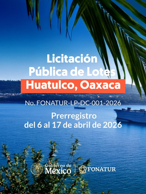 El Fondo Nacional de Fomento al Turismo (Fonatur) lanzó hoy la Licitación Pública No. FONATUR-LP-DC-001-2026 de lotes en el Centro Integralmente Planeado (CIP) Huatulco, Oaxaca, una acción institucional orientada a administrar de manera responsable y transparente su patrimonio turístico, fomentar la inversión productiva y fortalecer el desarrollo regional.