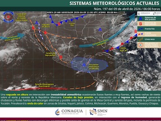 Esto es derivado de la presencia de una circulación anticiclónica ubicada en niveles medios de la atmósfera, en interacción con un canal de baja presión sobre el sureste de México.