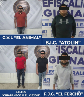 Los detenidos fueron identificados como B.I.C., alias “El Atolín”; F.J.G., alias “El Fercho”; J.C.H.S., alias “El Chiapaneco” o “El Viejón”; G.V.L., alias “El Animal”, y A.G.G., alias “La Mami”.