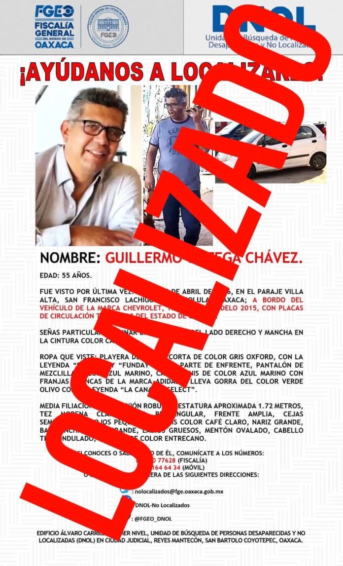 Oaxaca de Juárez, Oax., a 11 de abril de 2026.- La Fiscalía General del Estado de Oaxaca (FGEO) realizó la localización con vida de Guillermo Ortega Chávez, de 55 años de edad, quien había sido reportado como no localizado, gracias a las acciones coordinadas con la Policía Estatal. Asimismo, la institución mantiene abiertas las líneas de investigación para determinar la posible comisión de otros delitos y ha implementado medidas de protección en favor de la víctima y su familia.