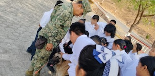 Asimismo, elementos de la Sección Canina realizaron una demostración de las capacidades de búsqueda y localización de estupefacientes mediante un binomio canino; además, impartieron una plática sobre su crianza y adiestramiento.