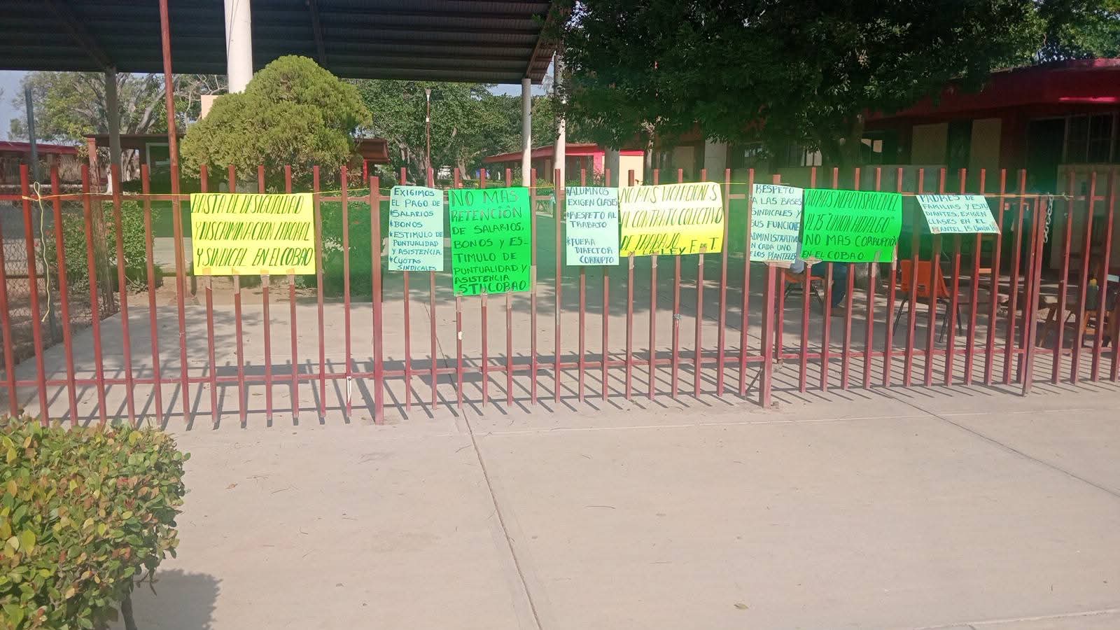 Durante la protesta, los empleados colocaron cartulinas en el acceso principal del plantel para visibilizar sus demandas y exigir la intervención de las autoridades educativas estatales.