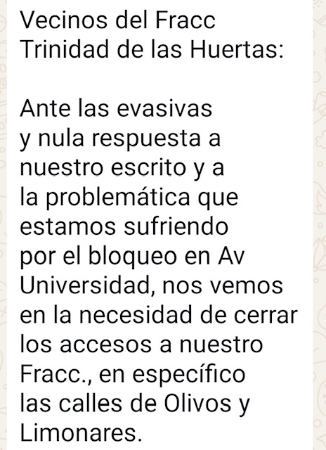 Ante la falta de respuesta de autoridades a sus demandas, vecinos del fraccionamiento Trinidad de las Huertas anunciaron el cierre de accesos internos como medida de presión y protección, luego de verse afectados por el bloqueo que persiste en Avenida Universidad.